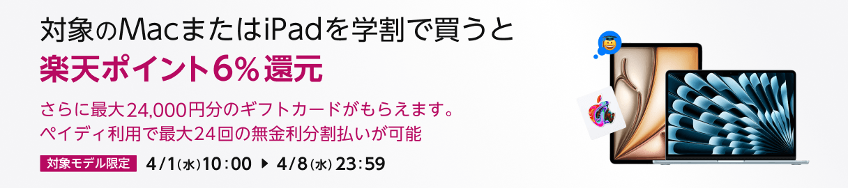 ※ 楽天ポイント 6.0% 還元対象製品;MacBook Pro / MacBook Air / iMac / iPad Pro / iPad Air