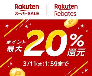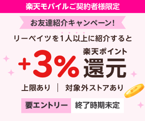 - リーベイツ でのお買い物は SPU プログラム(スーパーポイントアッププログラム)、楽天スーパーSALEの「ショップ買い回り」およびポイント変倍の対象外となります。